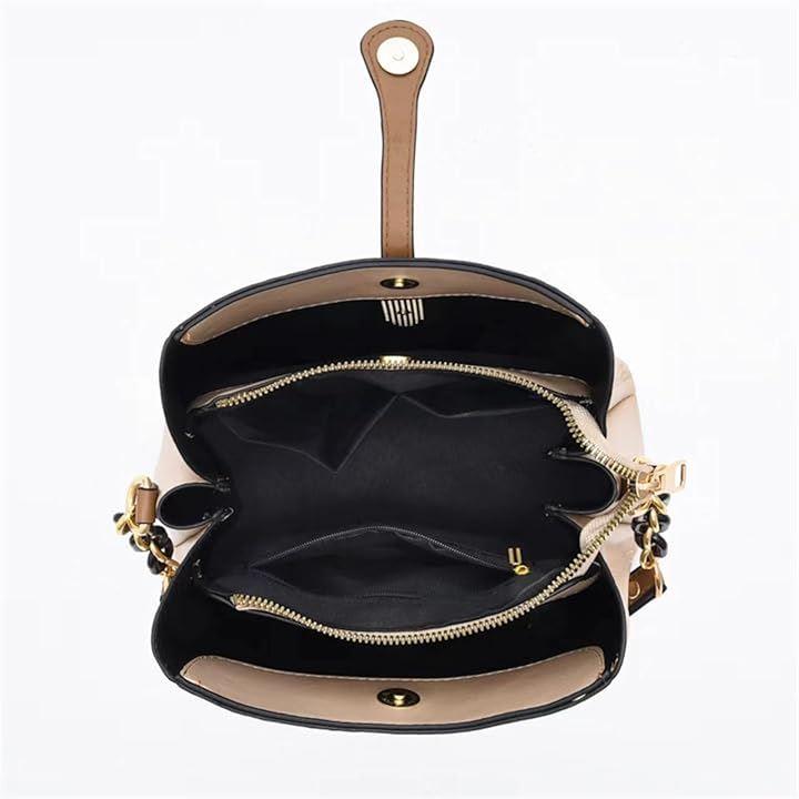 飽きのこないデザインで、ゴールドとブラックのチェーンがアクセントになり、シンプルなコーディネートに華やかさをプラスします。