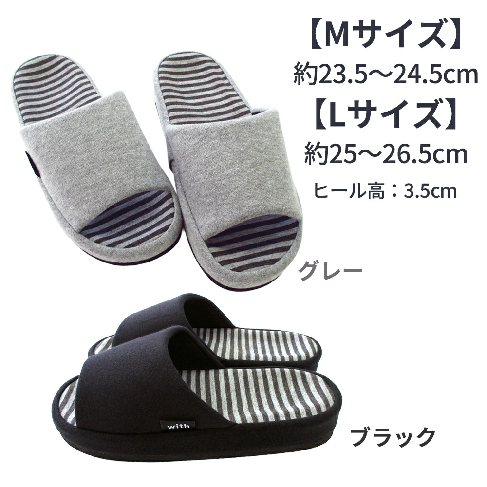 【商品名(JAN)】Withコンフォートスリッパ ブラック M NWAA7900(4969354300005)Withコンフォートスリッパ ブラック L NWAA7901(4969354300029)Withコンフォートスリッパ グレー M NWAA7900(4969354300012)Withコンフォートスリッパ グレー L NWAA7901(4969354300036)【適応サイズ(約)】M:約23.5~24.5cmL:約25~26.5cmヒール高:3.5cm【重さ(片足)】M:87gL:119g【材質】甲:ポリエステル・綿中板:ポリエステル・ポリウレタン底:ポリエチレン樹脂【製造国】中国【商品情報】足裏にフィットする形状のコンフォートスリッパ。シンプルモノトーンにスタイリッシュなボーダーの中板。洗えません。カラー:グレー・ブラック