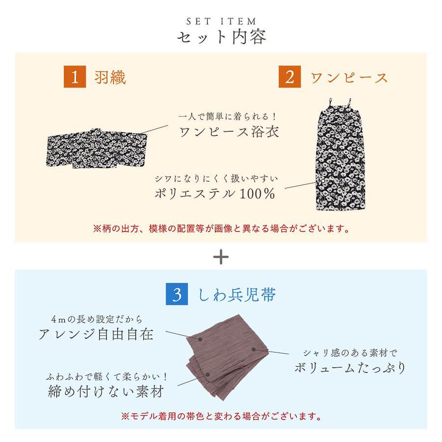 浴衣がもっと身近に、もっと簡単に楽しめる「ワンピース浴衣+しわ兵児帯」2点セットが登場!こちらはワンピース型のインナー浴衣と、羽織を重ねて帯を締めるだけの簡単仕様。着付けが苦手な方や、浴衣初心者の方にもおすすめです。ひとりでたった数分で着られるから、忙しい日でも安心。