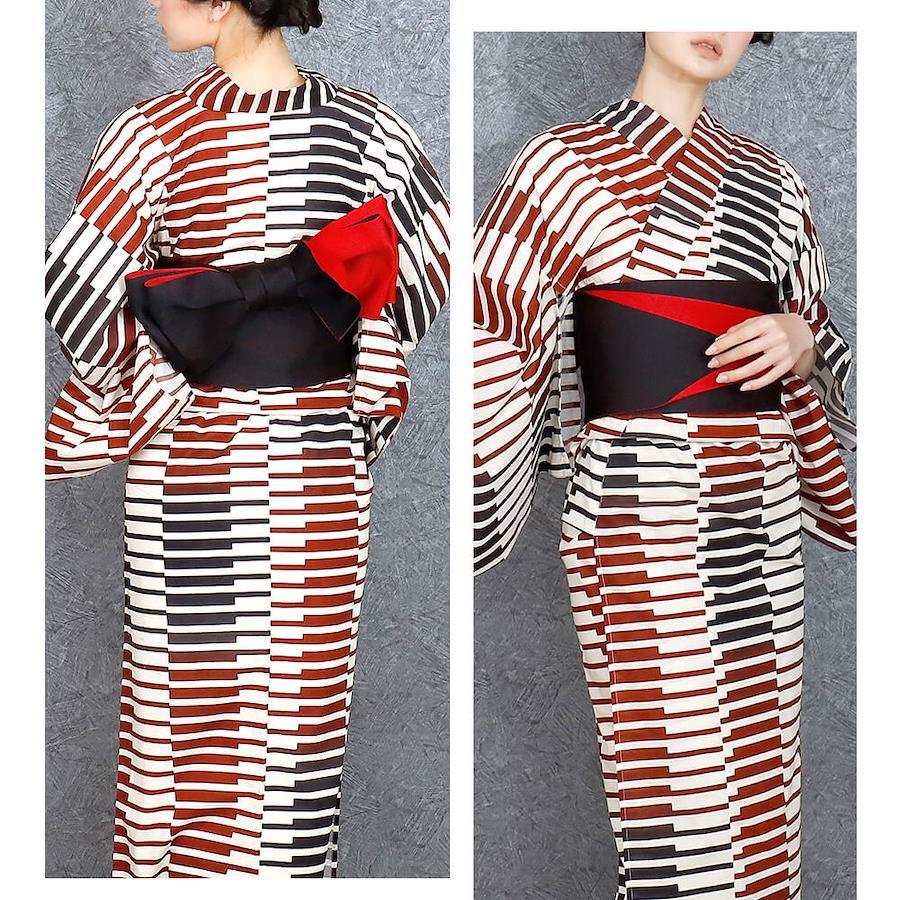 大胆で洗練されたストライプ柄が魅力の「レトロ縞」は、シンプルながらも存在感のあるデザインで、粋な浴衣スタイルを演出します。深みのある赤と黒の縞模様が、視覚的にもシャープな印象を与え、帯の合わせ方で印象を自由に変えることができます。