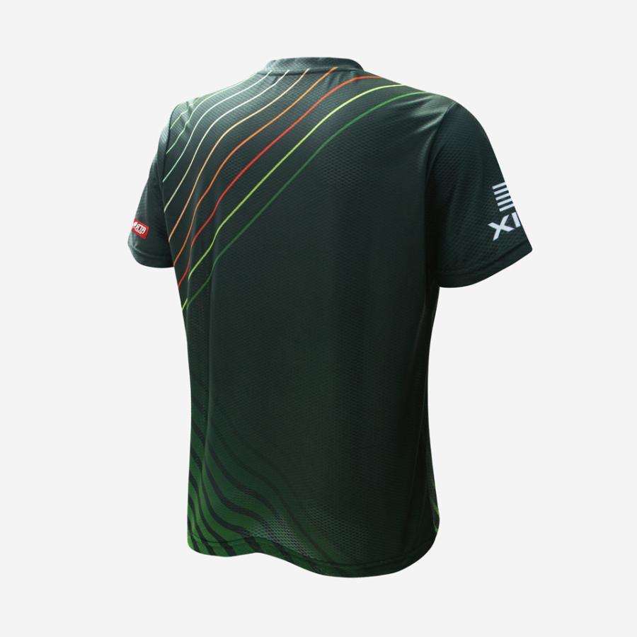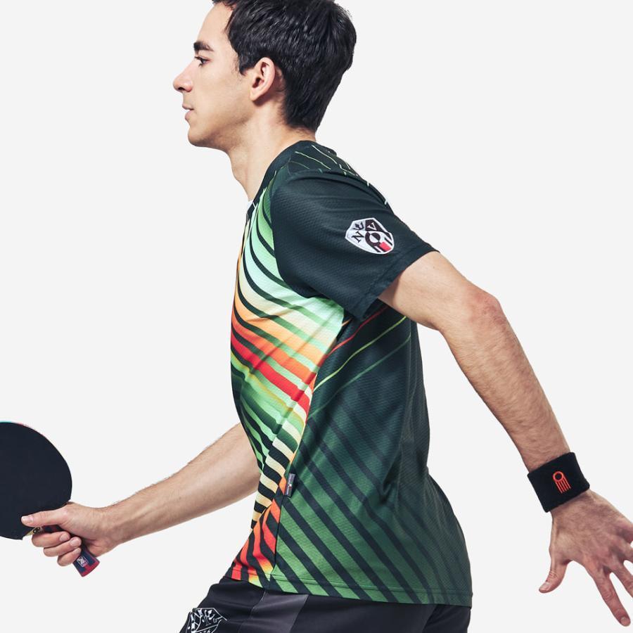 日本卓球協会公認4 月発売テンパ洗練されたグラフィックのグラデーションデザイン2 色(ダークグリーン・ネイビー)/ ポリエステル 90% ポリウレタン 10%サイズ : XS / S / M / L / XL / 2XLイタリア製の生地で、ジャカードのオープンメッシュスパンデックスで作られています。吸汗機能により、プレー中もドライな状態を保ちます。三日月形のジャカード菱形パターンのオープンメッシュスパン素材を使用しています。この生地は、イタリアおよびヨーロッパで最も革新的で重要な繊維生産地域として知られるコモ地方の工場で生産された、最高級の機能性ファブリックです。* 広告付きユニフォームの注意事項広告付きのユニフォームの為、中体連・高体連・国体など一部の試合で着用できない場合があります。
