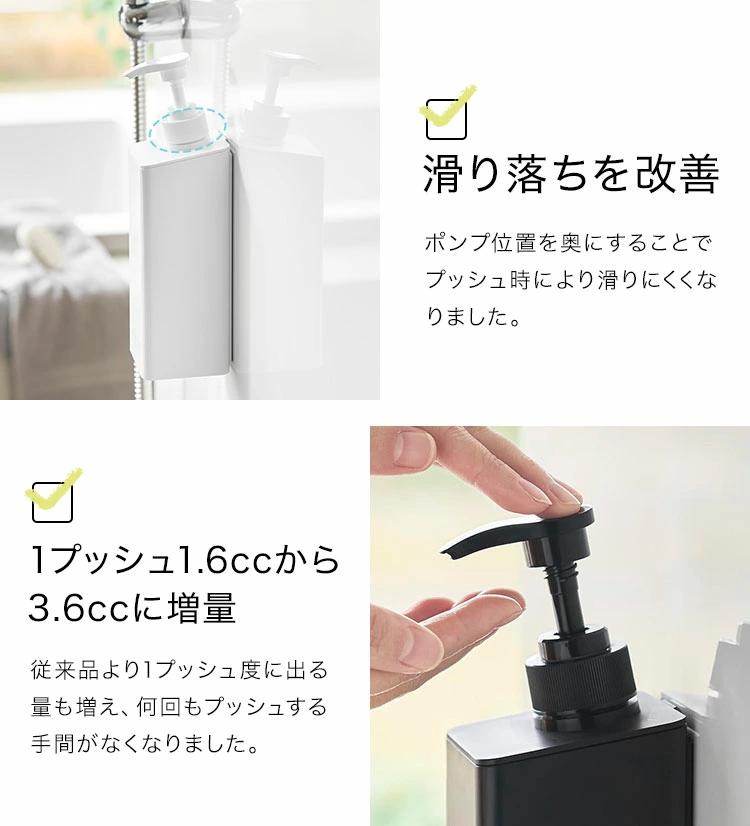 【たっぷり洗剤が出るマグネットディスペンサー】ポンプ位置を奥にすることで当社従来品よりも滑り落ちを改善。1プッシュで出る量も1.6cc→3.6ccにアップしました。マグネットがつく壁面に簡単取り付け。浮かせるので底がぬめらず衛生的です。そのままポンプを押して液体を出せます。蓋が外れるのでお手入れや詰め替えが簡単。詰め替え用パックがそのまま入ります。
