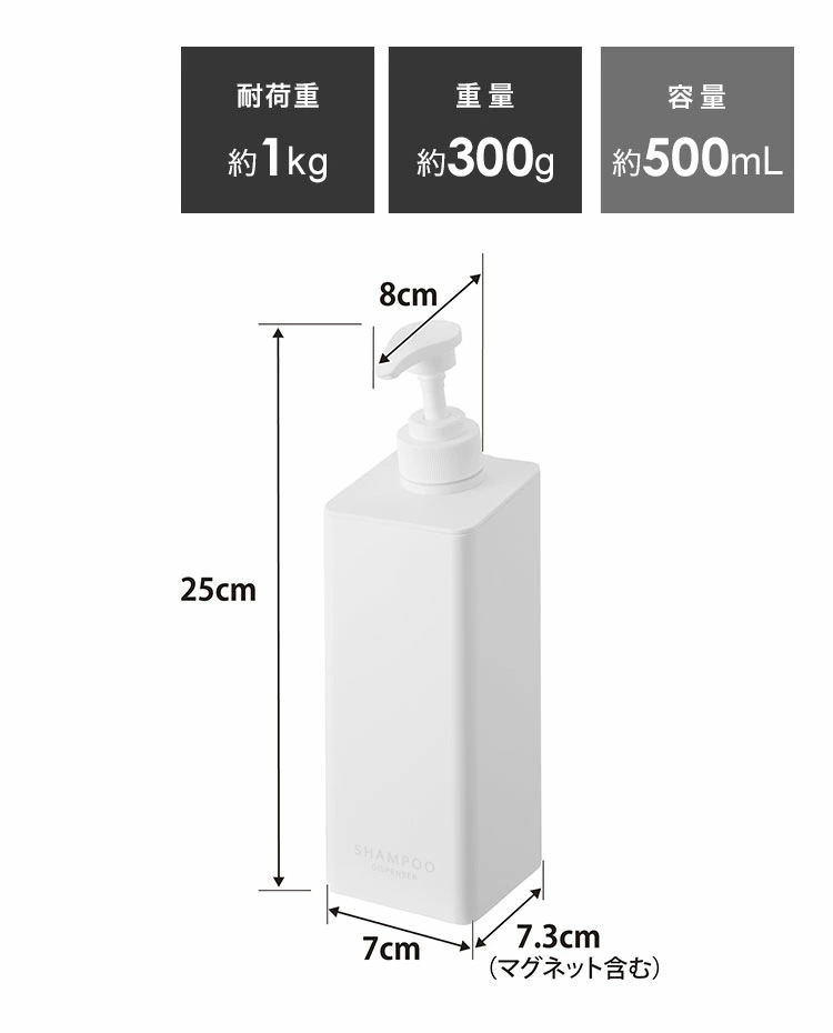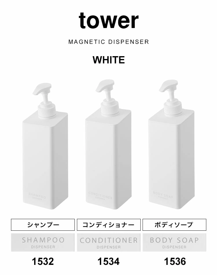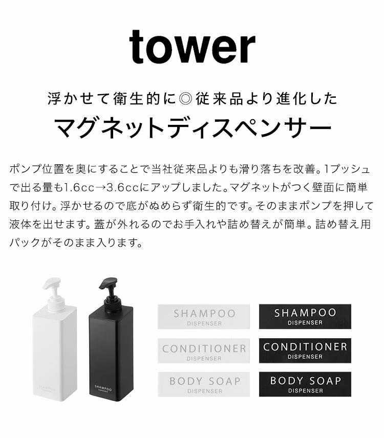 山崎実業 たっぷり洗剤が出るマグネットディスペンサー タワー 1532 1533 1534 1535 1536 1537 tower シャンプーボトル 詰め替え そのまま マグネット式 袋ごと入る コンディショナー ボデ [ymj-1532]
