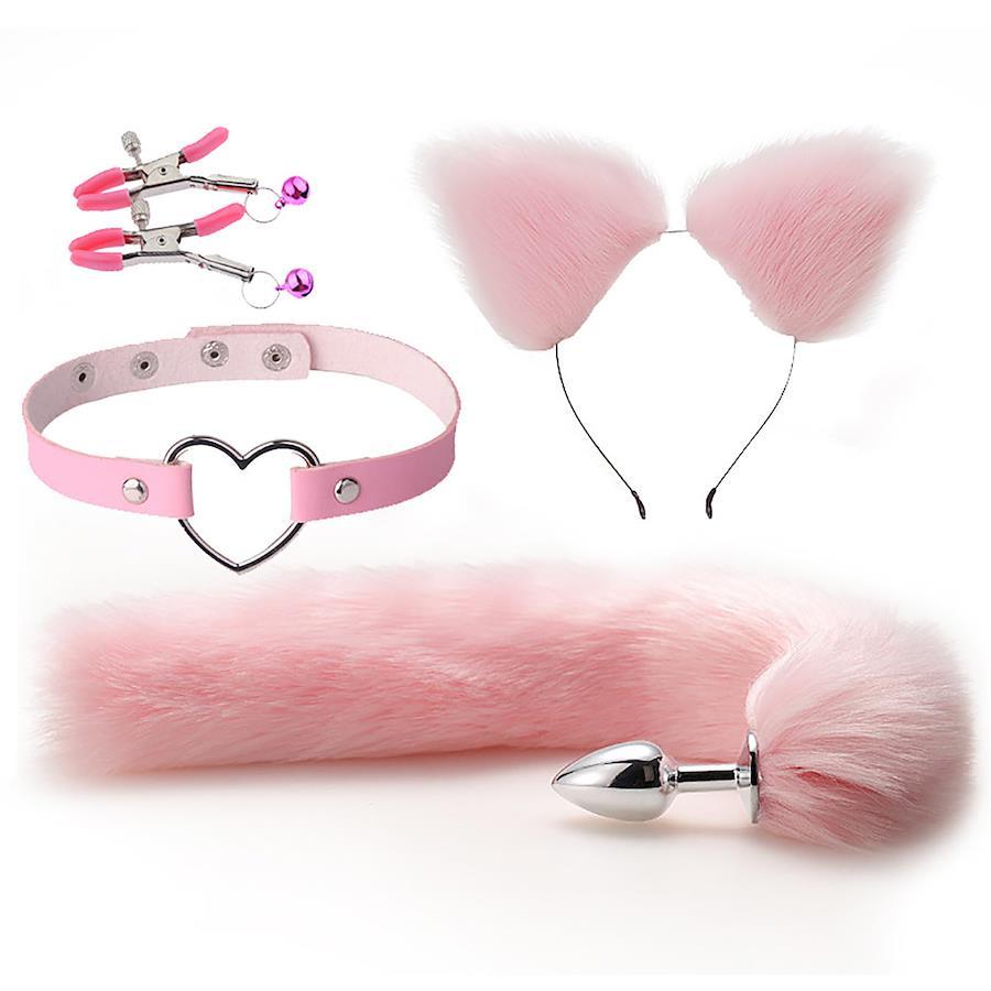 Yemax アナルプラグ 尻尾 乳首クリップ 猫耳カチューシャ チョーカー 首輪 人間 sm アダルトグッズ 女性 コスプレセット 女性用 SMプレイ用 制服風 smグッズ コスチューム 4点セット-ピンク