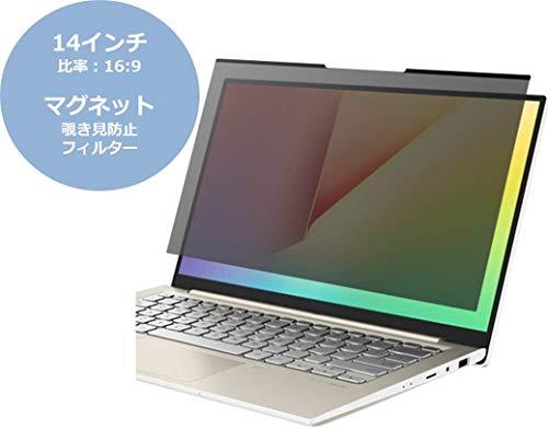 【対応機種】14インチ 縦横比16:9 寸法:フィルター部分のみ 309×180mm(縦幅のばらつき:-6mm?+1mm 横幅のばらつき:-1mm?+1mm), 上部の黒い部分は約9mm.。画面とベゼルの高低差により画面がややぼやけて見える場合が御座います。 マグネット付着位置に磁力に反応するセンサーが内蔵されている一部の機種はご利用頂けない場合が御座います。付属のマグネットを使用し、お確かめの上ご利用下さい。