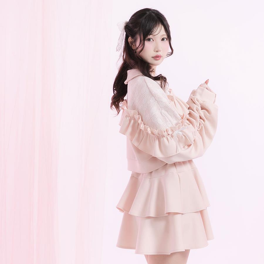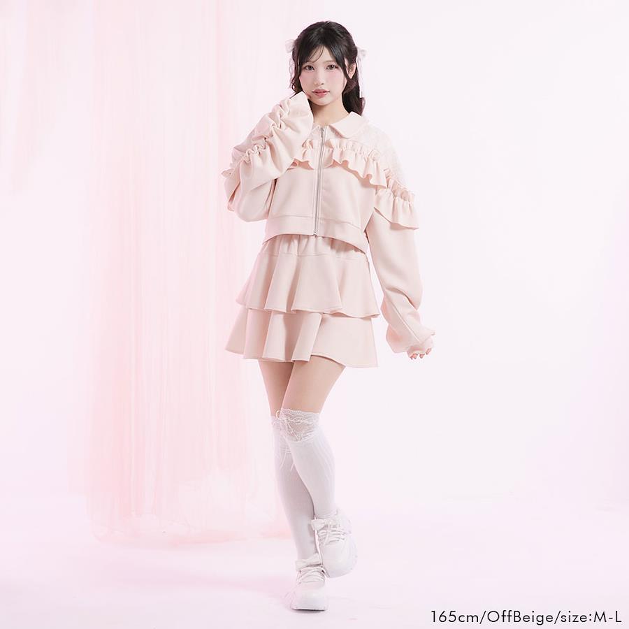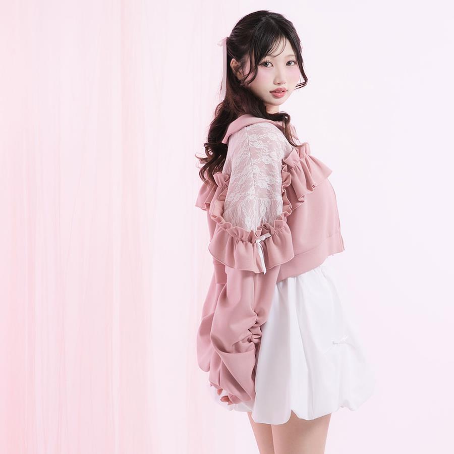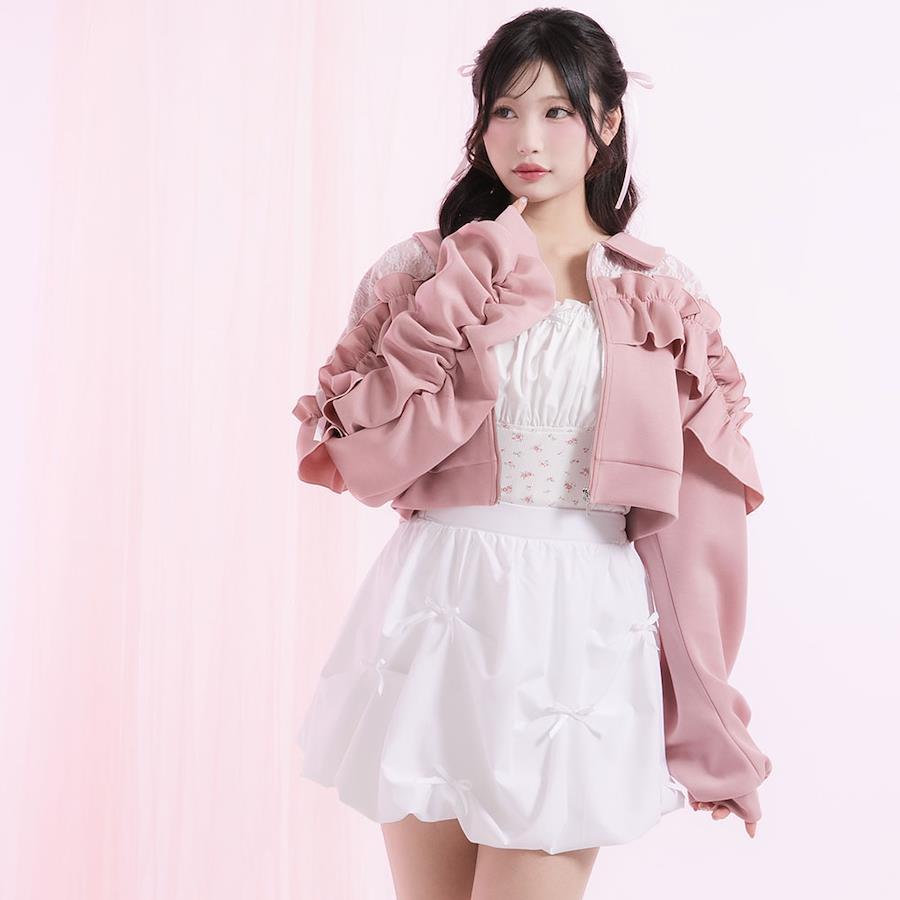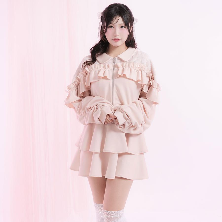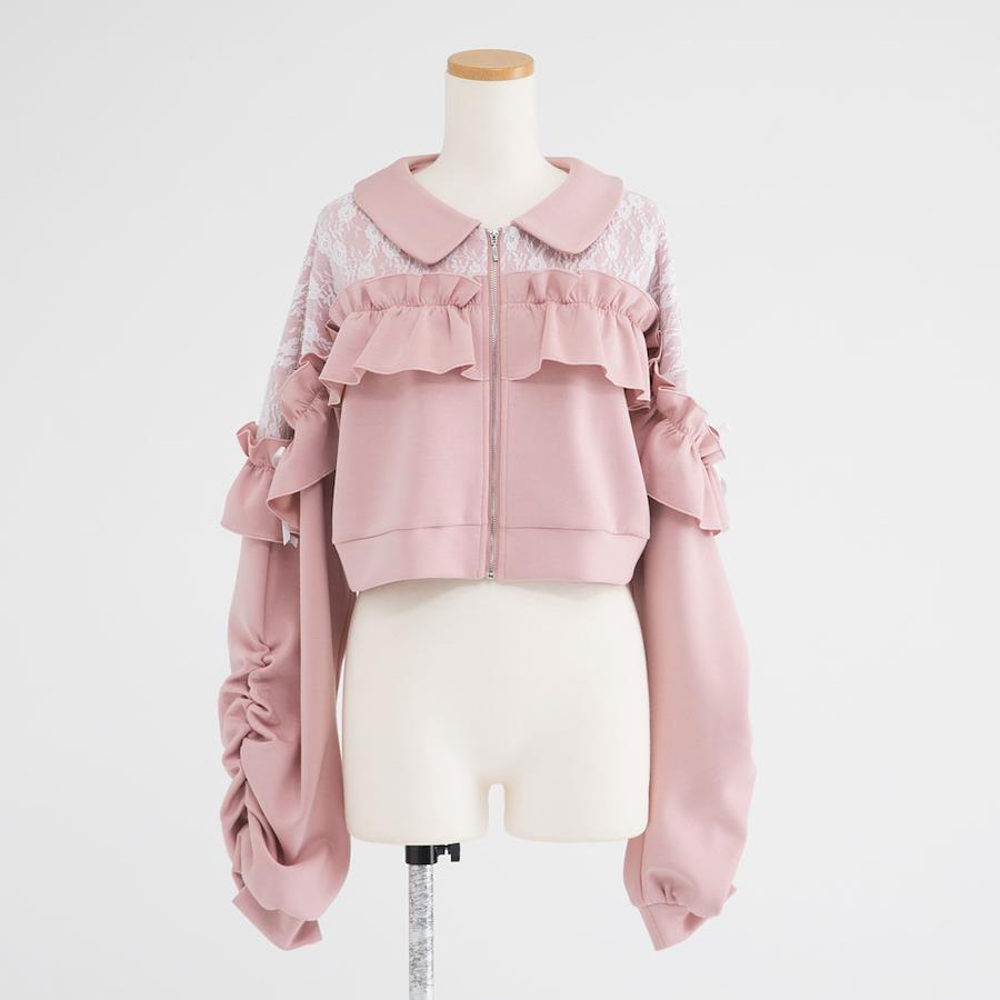 ガーリー×スポーティーが旬なブルゾンのご紹介♪【デザイン】たっぷりのフリルとヨークレースが目を惹くブルゾンです。フロントファスナーを開けて羽織れる仕様です。フリルは後ろ身頃までつけたので、後ろ姿まで抜かりなく可愛いデザイン◎お袖にちょこんと付けたリボンがアクセントに!襟元は丸みのある角襟にして、ガーリーさをプラスしました。お袖はギャザーをたっぷり寄せてボリューム感を出した、あざとくてイマドキなデザイン♪長すぎず短すぎない着丈にしたので、スタイルUP効果も抜群です!