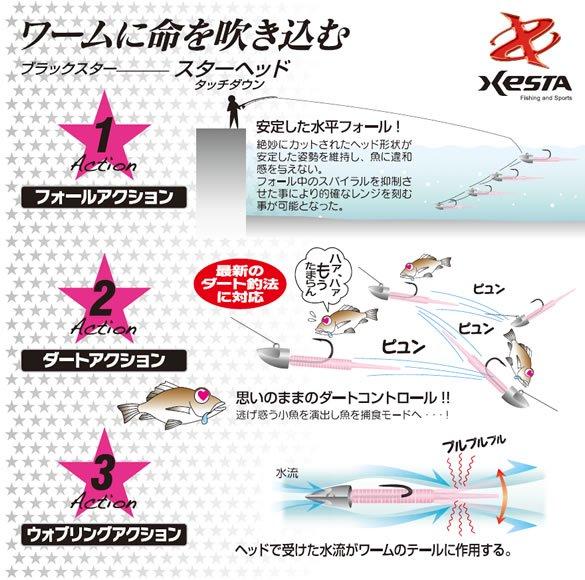ジグヘッドに求められるフォール、ダート、スイミングの3要素。スターヘッドタッチダウンはこれらをバランスよく持ち合わせ、ほぼノーテンションの状態でも安定した水平フォール姿勢をキープしバイトを誘発。鋭角なノーズ形状により素直なダートアクションを演出できる。レトリーブではヘッドの左右に施した『窪み』により乱流を発生させソフトルアーのテール部分に作用し、絶妙なウェブリングアクションを発生させる。フックはカルティバ製のオリジナルカラーフックを使用し、耐久性を高めている。メバルやカサゴ等のロックフィッシュから近年流行のアジング、チヌのボトムゲーム等幅広いライトゲームに対応したオールラウンダーだ。