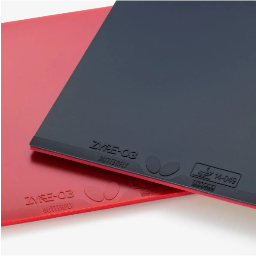 『ザイア03』は、低いツブを密集させた「リコシート※」と分厚いスポンジを搭載したラバーです。この構造に、球持ちがよく摩耗耐久性に優れたシート配合と、硬めの「スプリング スポンジX」を合わせました。回転による威力を引き出す“開発コードNo.303”のツブ形状を採用した『ザイア03』は、うねるような軌道で相手コート深くに入り込む打球を可能にします。回転量の多いパワフルな打球でラリーを支配したい選手にお勧めです。